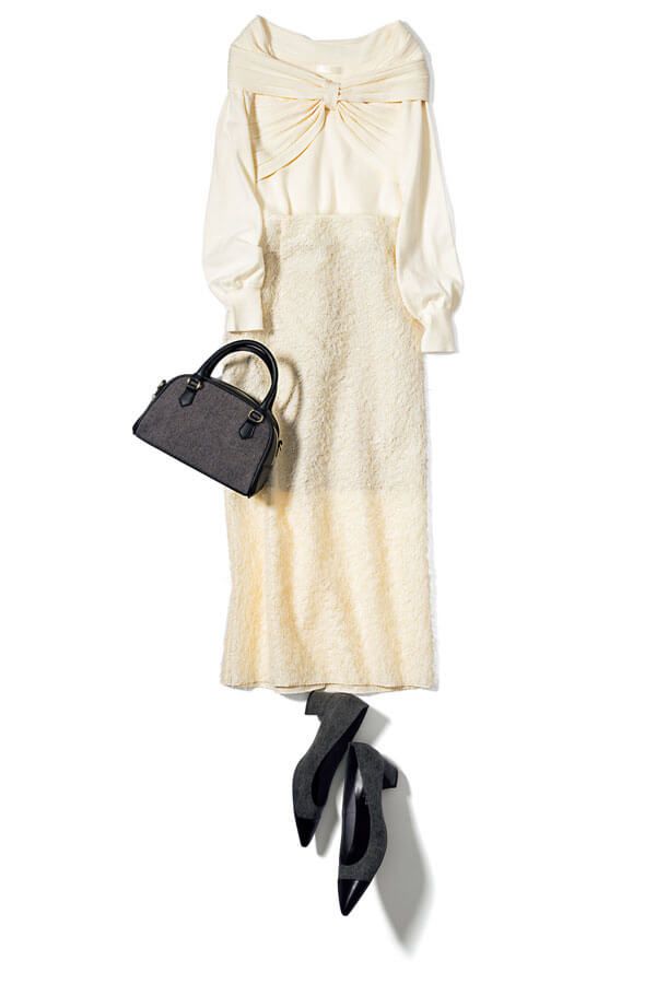 スカート¥5,489/ロペ ピクニック(ジュンカスタマーセンター) ニット¥4,950/アストリア オディール(アストリア オディール ルミネエスト新宿店) バッグ¥4,178/grove(ワールド プレスインフォメーション) 靴¥11,000/アルテミス by ダイアナ(アルテミス by ダイアナ アーバンドック ららぽーと豊洲店)