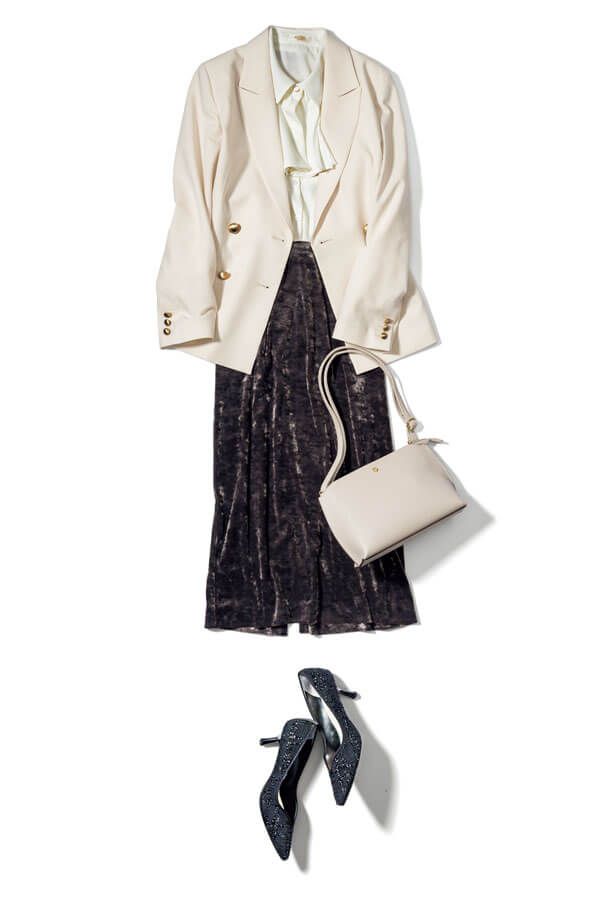 ジャケット×ボウタイ×ペンシルの王道通勤スタイルに、ベロアの投入で新鮮さを。