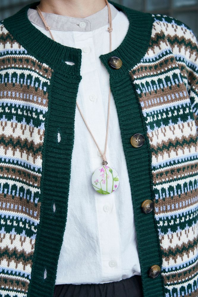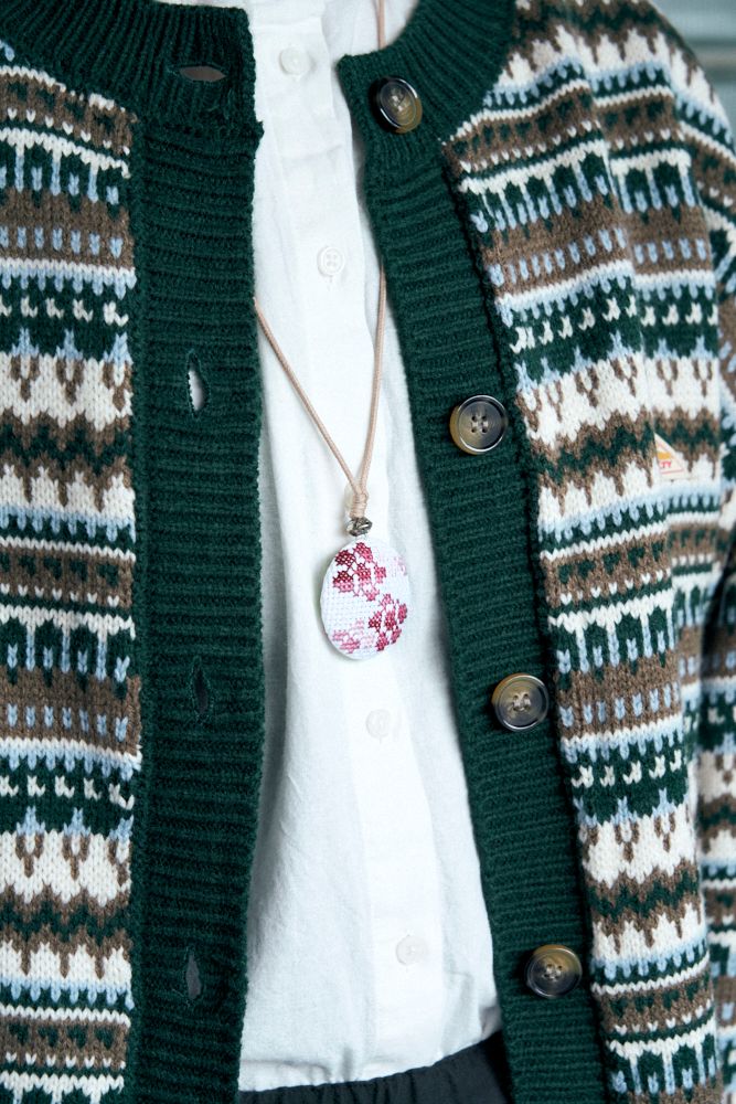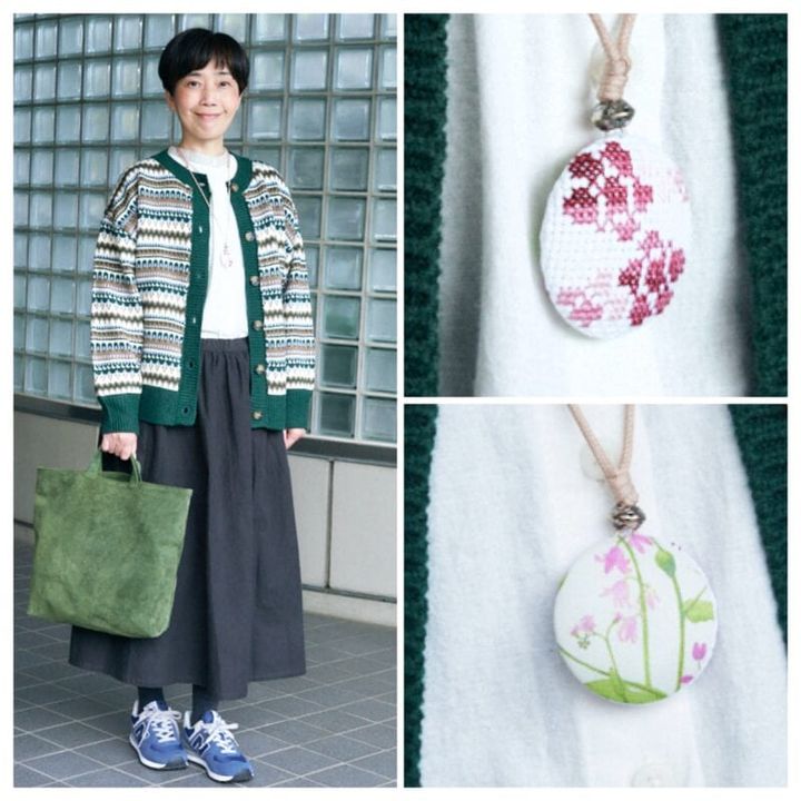 「仕事中は、本の整理中に引っかけてしまうからつけませんが、オフの日や仕事のあとにつけて楽しみます」。表裏に刺しゅうが施された手仕事の味わいのあるペンダント(こちらは表側)。「以前、学校図書館に勤めていたとき、生徒のお母さまからいただいたもの。気に入ってよくつけています」