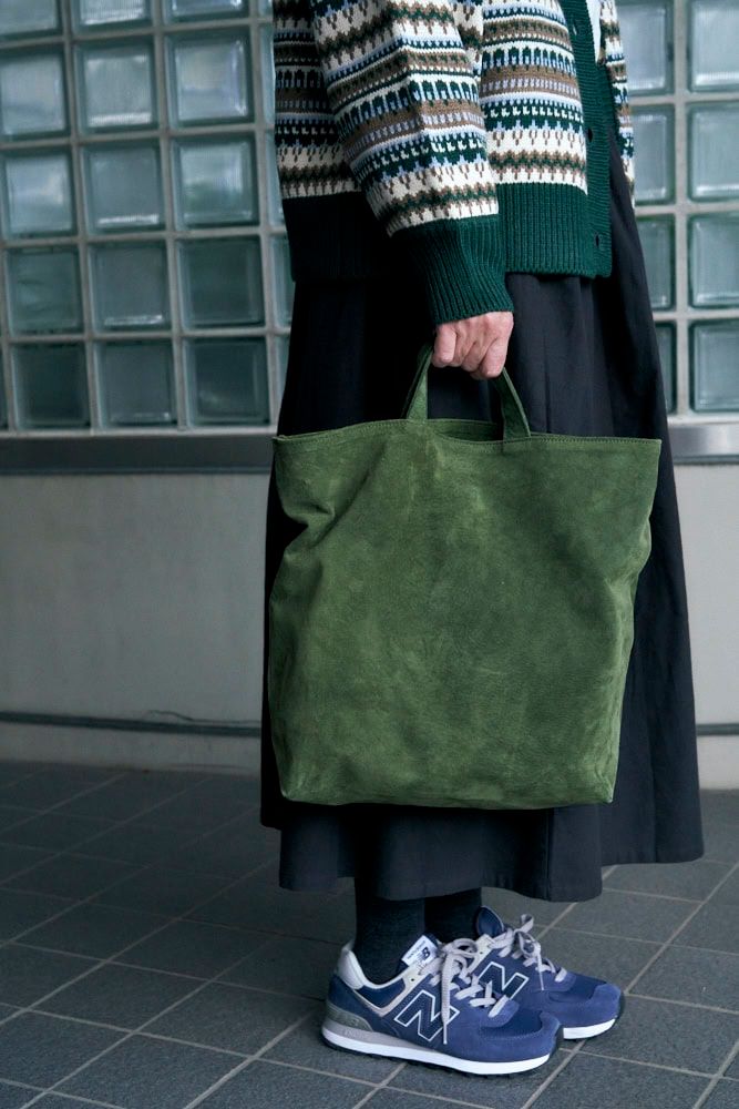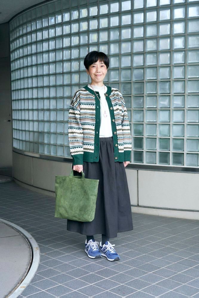 北欧風カーデと合わせてオリーブグリーンのトートバッグを。「グリーンが大好きで、コーデの差し色によく使います。このバッグは火曜日に持っていた2WAYのスエードのトートですが、この日のコーデには肩に掛けないほうがバランスがいいと思って」