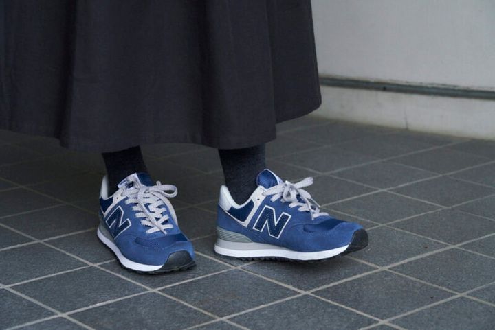 ネイビーカラーも形も気に入っているスニーカー。シンプルなデザインのスカートには、スポーティなスニーカーを合わせて、抜け感を。