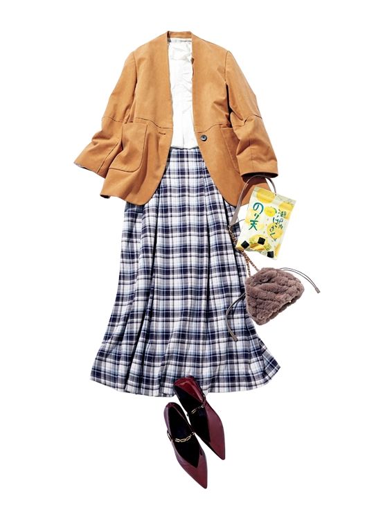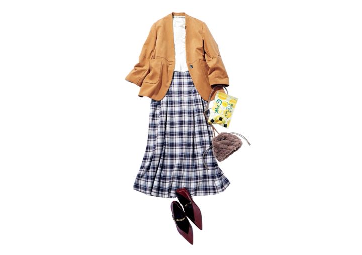 フリルブラウス¥20,790/APEL チェックスカート¥15,400/MERCURIDUO(MERCURYDUO ルミネエスト新宿店) キャメルジャケット¥33,000/リエルリシェ ファーバッグ¥13,200/ノエラ チェーン付きパンプス¥30,800/銀座かねまつ(銀座かねまつ6丁目本店) 瀬戸内のはっさくのり天/編集部私物