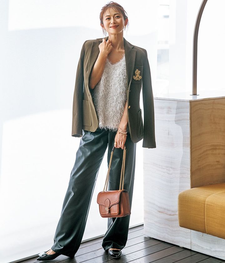 プルオーバー¥19,800(カデュネ)パンツ¥29,700(イウエン マトフ/ユナイテッドアローズ 麻布台ヒルズ ウィメンズストア)ジャケット¥38,500バッグ¥53,900(ともにローレン ラルフ ローレン/ラルフ ローレン)フラットシューズ¥174,900(ジャンヴィト ロッシ/ジャンヴィト ロッシ ジャパン)ピアス¥124,300リング¥121,000(ともにウノアエレ/ウノアエレ ジャパン)3 連ブレスレット¥14,740(エティカ/ZUTTOHOLIC)
