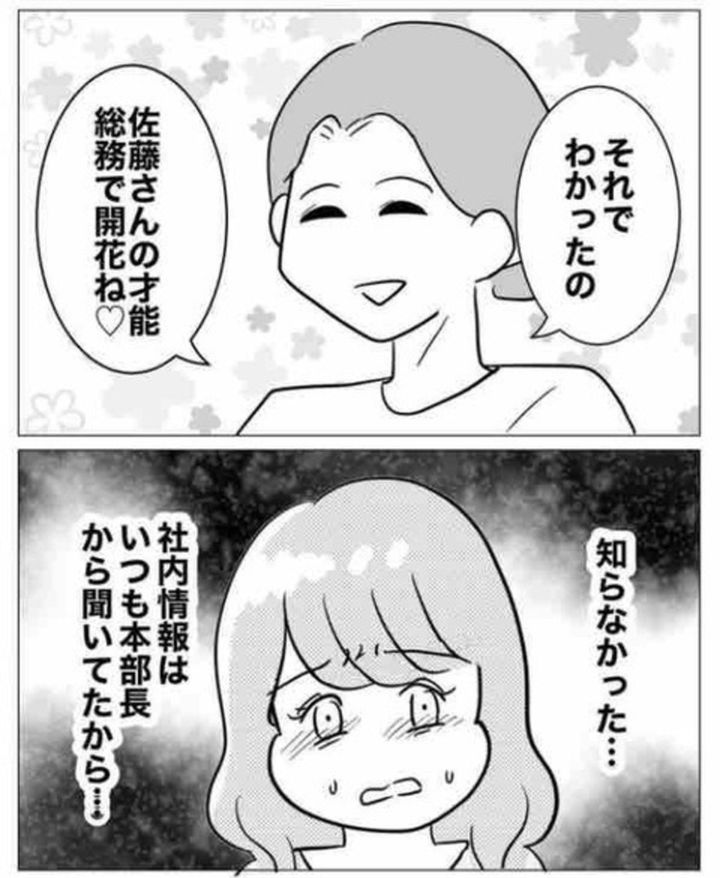 若さを武器に、自分の都合のいいように人間関係をコントロールしようとした腹黒さん。しかし、結局は自分でしたことが自分へと返ってきたのです。「社内事情に詳しい」と思っていたのも、結局は本部長からの情報ありきでした。他人の権威を利用して威張るのではなく、1人の人間として成長していくべきと考えさせられるお話でした。