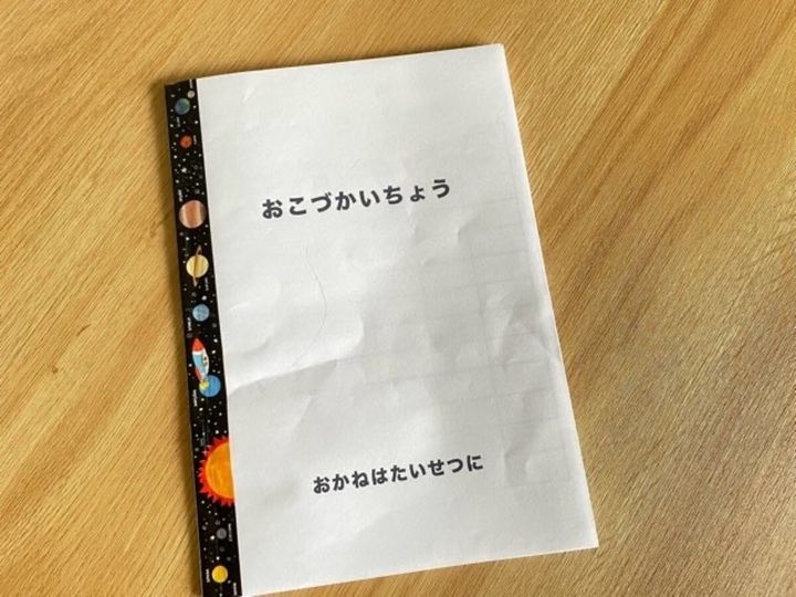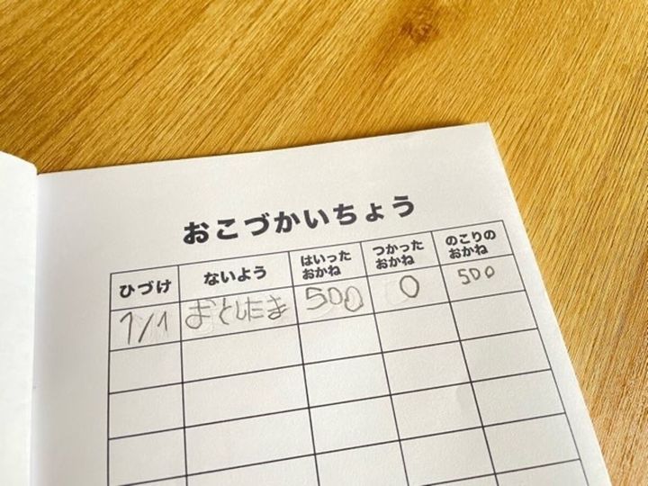 このお小遣い帳を初めて渡したのは、小学校入学前。ひらがながスラスラ書けずに当時は挫折してしましましたが、小学校に入学し、ひらがなを覚えたのでお小遣い帳は再開しました。