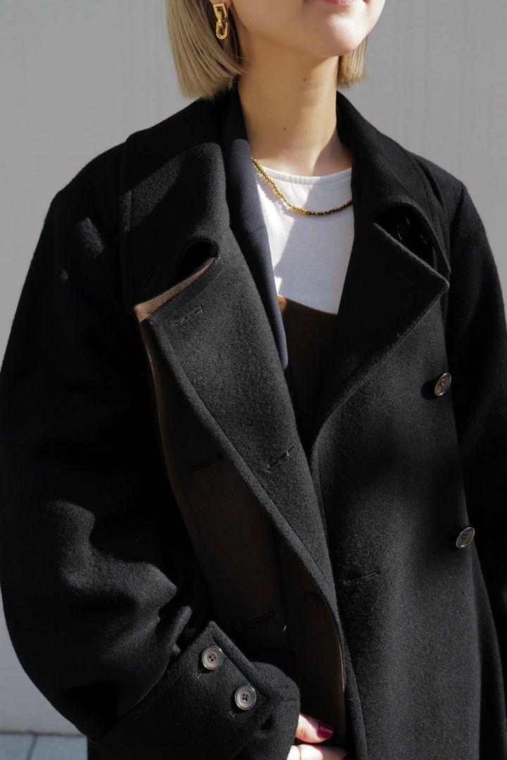 「アメリのアウターは、シルエット、生地、ひとくせデザインにこだわっているものがほとんどです。今回のアウターもAラインのキレイなフレアシルエットで、国産のメルトン仕上げのウール地を使用した上質な一枚」コート¥47,300(アメリ/アメリ ヴィンテージ)