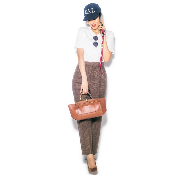 キャップ¥7,900(CA4LA/CA4LA ショールーム)サングラス¥62,000(DITA/DITA青山本店)バッグ¥156,000(ザンケッティ/ハウント代官山/ゲストリスト)パンプス¥21,000(ツル バイ マリコ オイカワ)ピアス¥23,000(モダン ウィーヴィング/デミルクス ビームス 新宿)