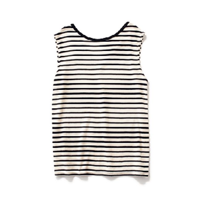 後ろがV開きのひとくせボーダーで、夏限定の背中見せオシャレを。ノースリーブカットソー¥10,000(ルミノア/ゲストリスト)