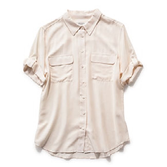 ポケットがアクセントのとろみブラウス。上質なシルクの素材感が素敵! 半袖ブラウス¥25,000(エキップモン/サザビーリーグ)