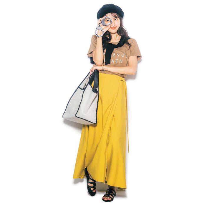 夏らしい着こなしに映える鮮やかイエロー。ウエストのベルトデザインがアクセントに。フレアスカート¥6,945(スタイルデリ)