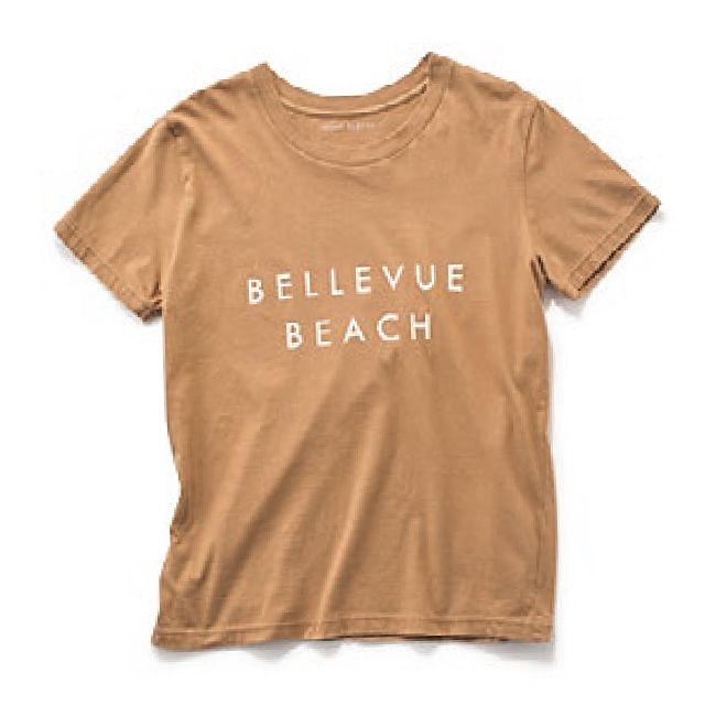 旬のロゴTは、ベージュ&小さめロゴをセレクト。あくまで大人っぽく着こなして。Tシャツ[別注]¥5,500(Upper Hights/PLST)
