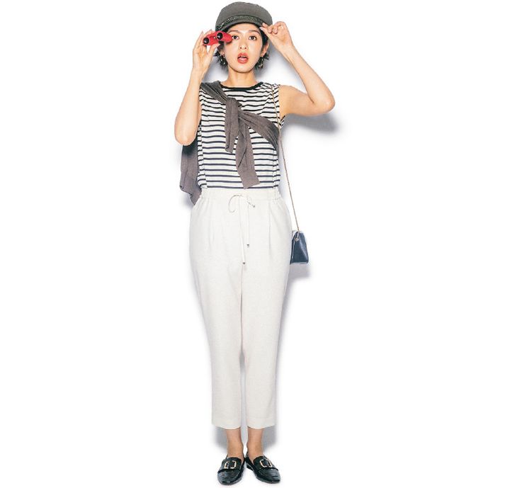キレイに着こなせるドロストパンツは、オフホワイトで夏らしくヘルシーに。パンツ¥17,000(BOSCH)