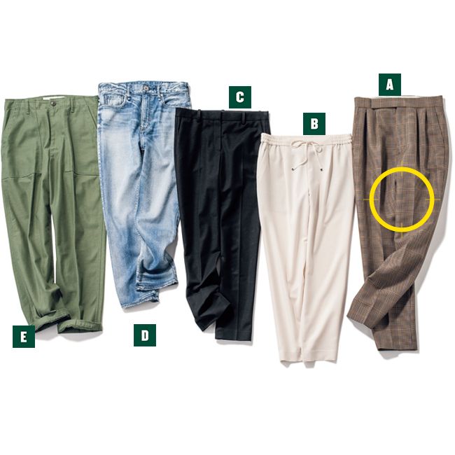 【A】ハイウエストでタック入りの旬ディテールが魅力。カッコいい雰囲気で着たい。チェックパンツ¥29,000(トラディショナル ウェザーウェア/トラディショナル ウェザーウェア 青山ウィメンズ店) 【B】キレイに着こなせるドロストパンツは、オフホワイトで夏らしくヘルシーに。パンツ¥17,000(BOSCH) 【C】オンオフ着こなしの幅の広さならダントツ! 美脚を約束するベーシックな黒パン。パンツ¥29,000(Theory/リンク・セオリー・ジャパン) 【D】カジュアル派マストなデニムは、着回し力抜群のスリムストレートを。デニムパンツ¥23,000(アッパーハイツ/ゲストリスト) 【E】ラフな気分にぴったりのベイカーパンツ。ハイウエストで旬なシルエット。ベイカーパンツ¥19,000(ザ シンゾーン/Shinzone ルミネ有楽町)
