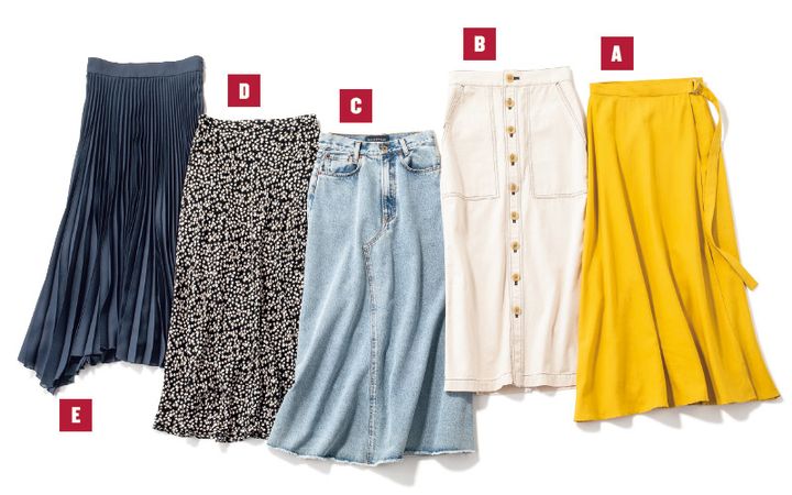 【A】夏らしい着こなしに映える鮮やかイエロー。ウエストのベルトデザインがアクセントに。フレアスカート¥6,945(スタイルデリ) 【B】フロントボタンのカジュアルなディテールが目を引く、オフホワイトのタイト。キレイめすぎない雰囲気が絶妙。タイトスカート¥13,000(アダム エ ロぺ/アダム エ ロぺ) 【C】流行の予感がするデニスカは、ロングのフレアで大人っぽくゆったり着たい。デニムスカート¥43,000(マディソンブルー) 【D】モノトーンの小花柄なら着回しやすく、デートにもデイリーにも重宝します。フラワープリントスカート¥8,990(PLST) 【E】端正なネイビープリーツは、アシンメトリーの揺れる裾で今っぽさと女らしさが出せる。プリーツスカート[9月末発売予定]¥9,200(Mila Owen)