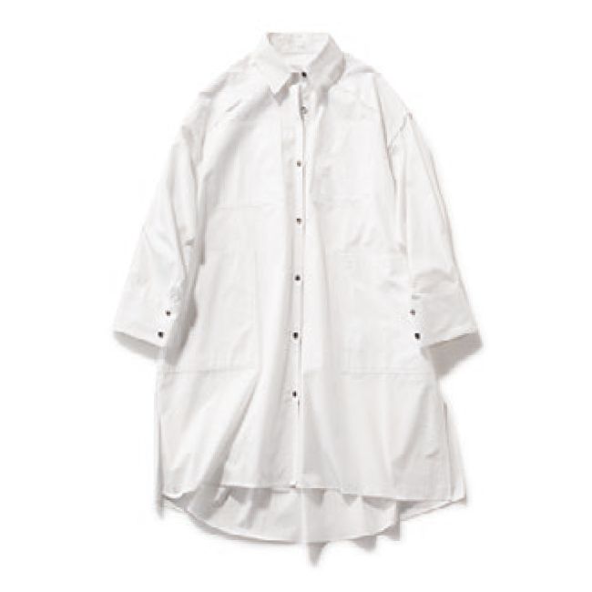 今年らしいロングシャツワンピは、パンツと相性抜群! シャツワンピース¥39,000(リト/デミルクスビームス 新宿)