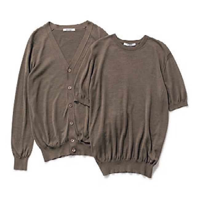 シックなブラウンニットは、アンサンブルで持っていると便利。ニットカーディガン¥31,000半袖ニット¥25,000(ともにスローン)