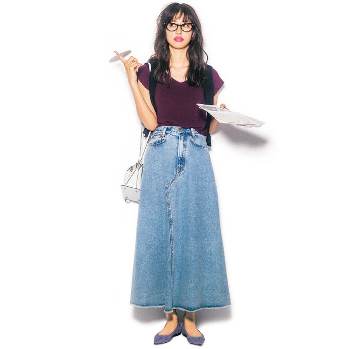 流行の予感がするデニスカは、ロングのフレアで大人っぽくゆったり着たい。デニムスカート¥43,000(マディソンブルー)