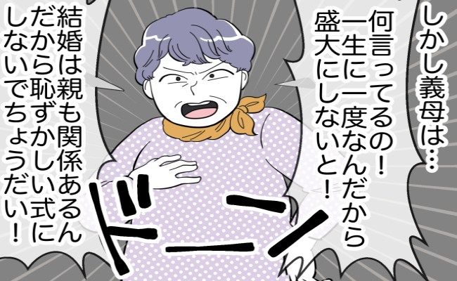 見学が終わったあと、義母が発した言葉は、「一生で一度の式なんだから盛大な式にするべきだし、結婚はあなたたち2人の問題じゃなく親も関係するもの。恥ずかしい式にしないでほしいわ」でした。