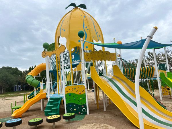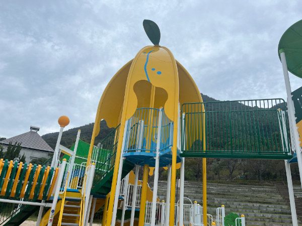1998年3月、日本初の柑橘系のテーマパークとしてオープン。 日本一のレモン・柑橘の島、しまなみ海道で知られる生口島 (いくちじま) に位置しています。 2022年8月にリニューアルオープンし、グランピング施設などを新たに設置しました。 2024年に今から紹介する大型複合遊具が完成しました。