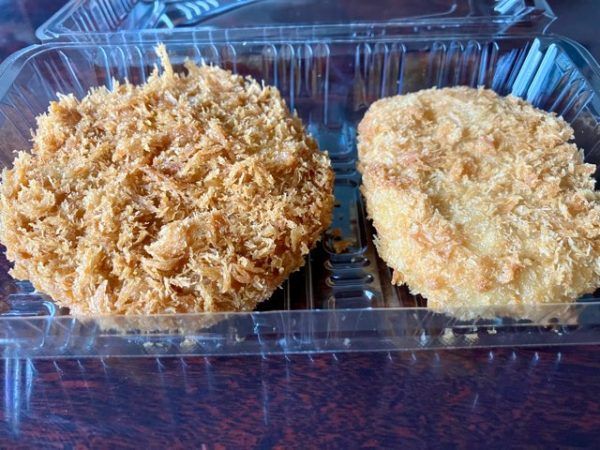 左がメンチカツ270円、右がにくたくコロッケ140円。