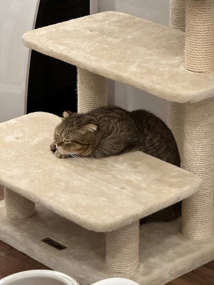 キャットタワーで眠っているのは、マンチカンの『たぬ吉』くん。 タワーの台に前のめりに寝ている姿は、まるで授業中に寝ている学生みたいです。