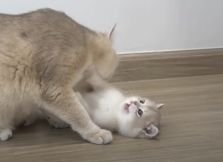 毛づくろいしてあげたいママ猫に、それよりも遊びたい子猫が抵抗!