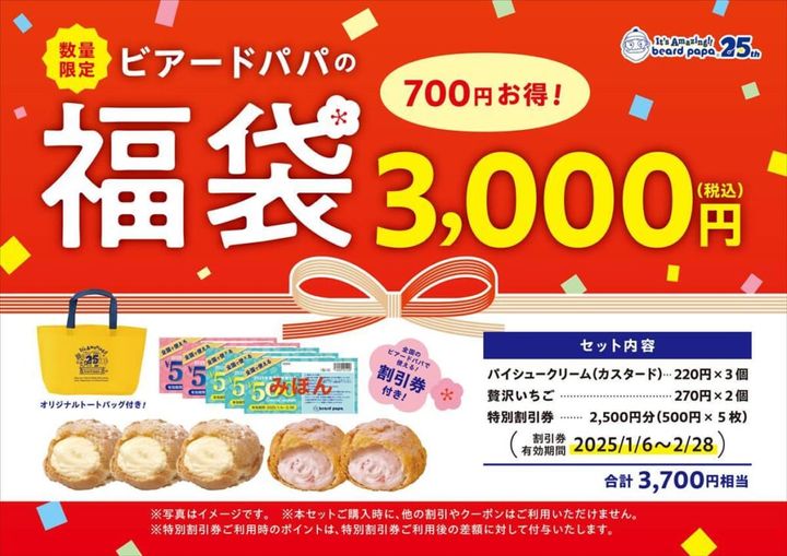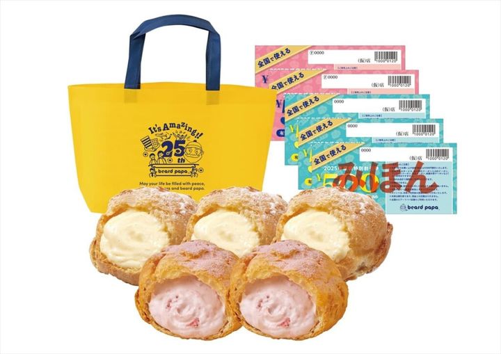 「ビアードパパ」の福袋が2025年1月1日(水)より数量限定で発売されます! 看板商品のシュークリームはもちろん、25周年を記念したオリジナルデザイントートバッグがセットになった特別な福袋ですよ!