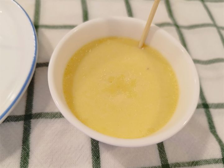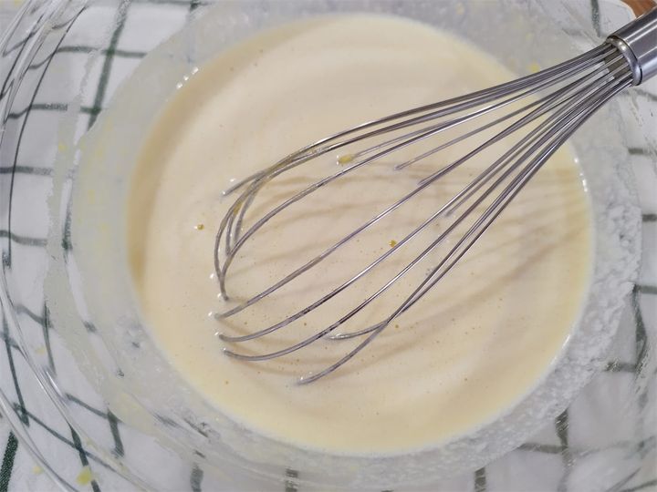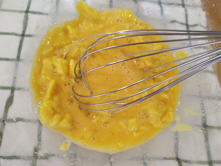 卵は割ってほぐし、泡立て器でなじませながら混ぜました。