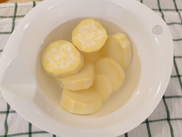 1. さつまいもは皮を厚めに剥いて、厚さ2cmの輪切りにして水にさらす。