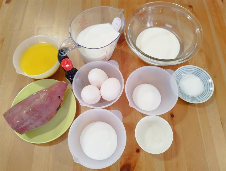 オレンジジュースでキレイ色に!「サツマイモのプリン」材料はこちら