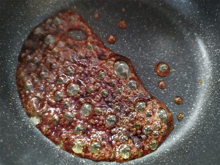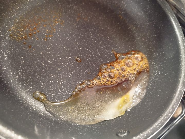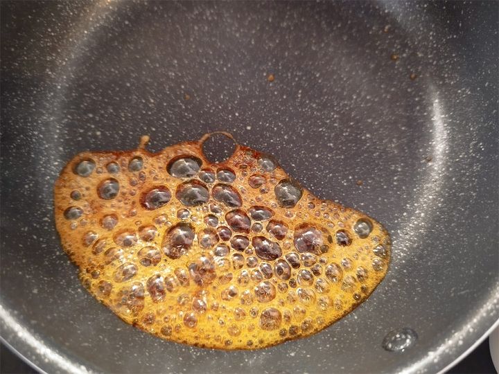砂糖の焦がし加減はお好みですが、わたしは白っぽい大きな泡が落ち着き、とろみが付いて飴色になったら火を止めました。