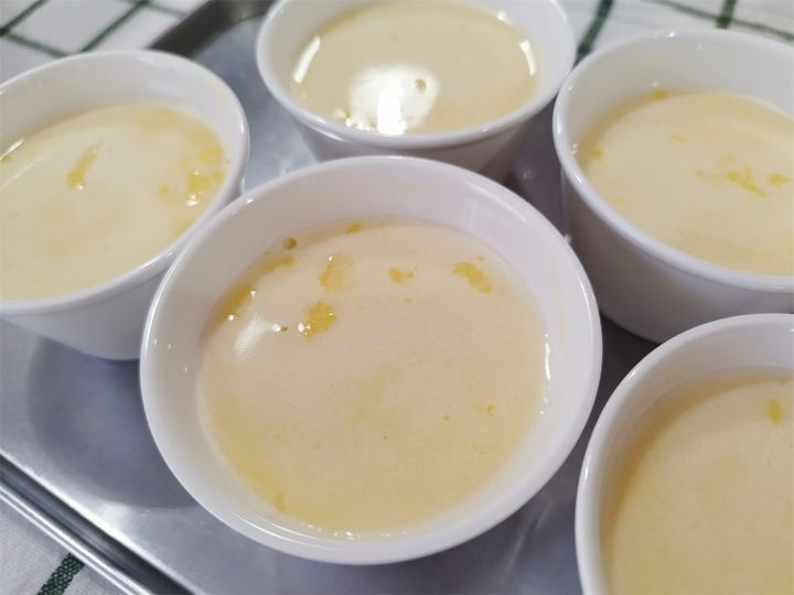 6. 5のプリン型の中に4の生地を静かに入れ、蒸し器で20分蒸す(蒸し器は温めておく)。