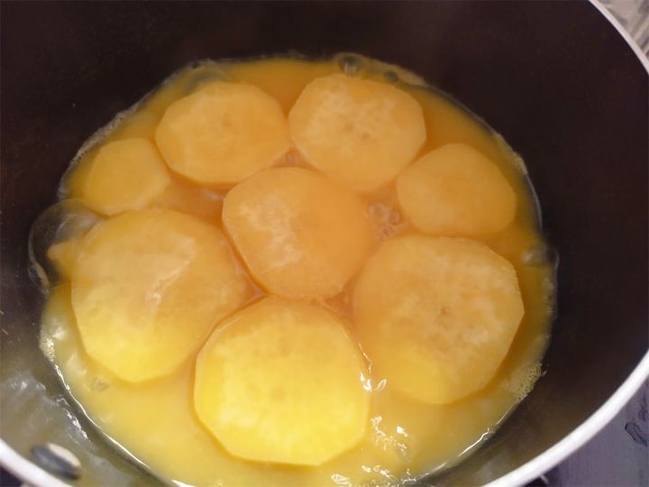 2. オレンジジュースを入れた鍋に1のさつまいもを入れて、水気がなくなるまで煮る。