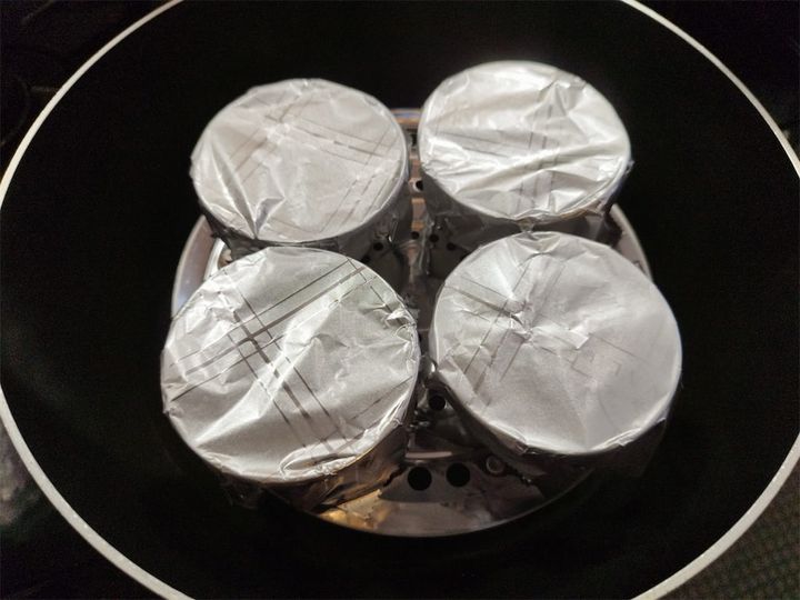 プリン型は、水滴が入らないよう、アルミホイルであらかじめフタをするのがコツ。