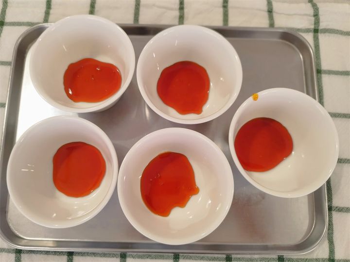出来上がったカラメルソースをプリン型に分けます。