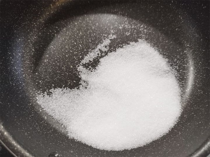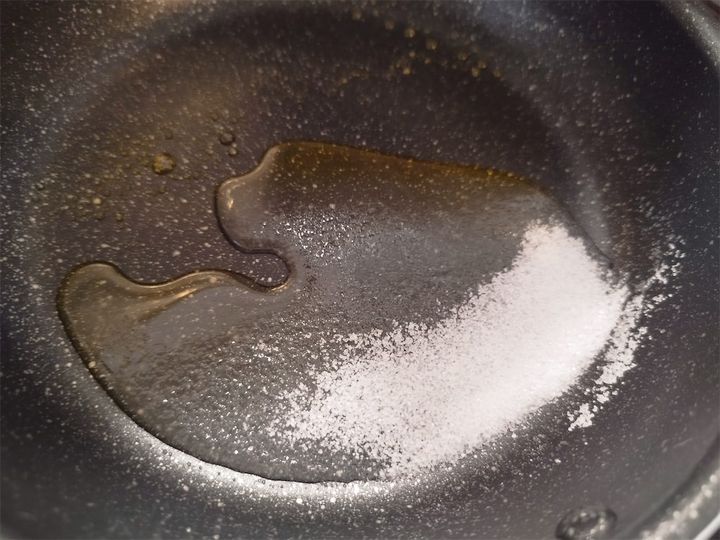 元のレシピには小鍋でとありましたが、わたしは、砂糖を焦がしたときの色の変化がよく見えるよう、底の浅いフライパンを使いました。