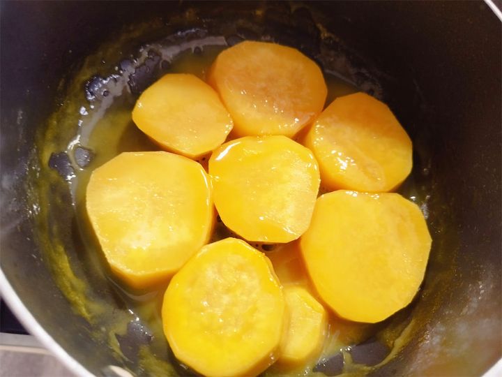 その後はフタをとって、水気が飛ぶまで煮ました。さつまいもがきれいなオレンジ色に染まっています!