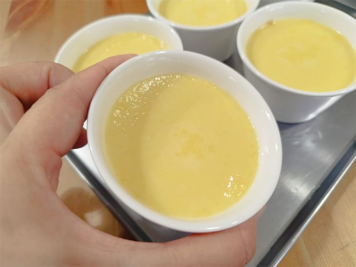 プリンは、火を強くし過ぎると「す」(細かい穴)が入りやすくなり、弱過ぎると固まらないので、火加減が重要です。