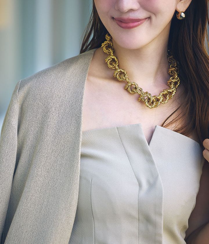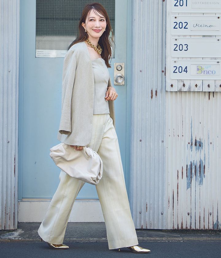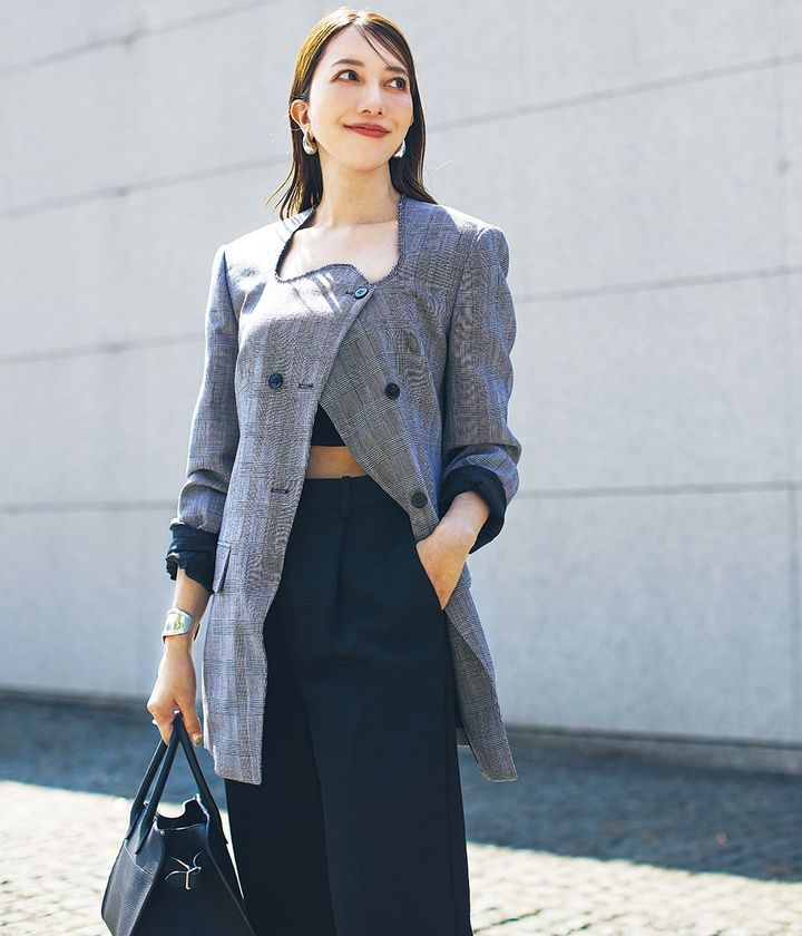 肌見せを知的にさせるジャケット×ビスチェのコンビは、ニュアンスカラーを選ぶことでエレガントな韓国っぽさに。ボトムスはパンツでバランスを整えて。