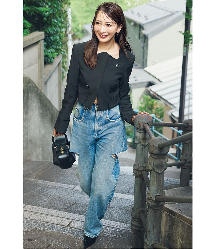 韓国ブランド・RECTOのようなデコルテ見せが叶うブランドを発見! 短か丈でトレンド感も◎。ジャケットに甘さがあるので、デニムをラフに合わせて抜け感を。
