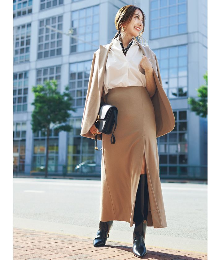 かっちり白ブラウスにスカーフで財閥系奥様コーデを再現。スカートとのセットアップは女っぽくなりすぎないようモードなブーツ&コンサバ小物を足します。