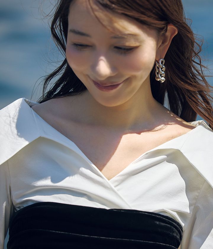 トレンド感とデザイン性が高く、他の人と被らないオシャレが叶うブランド。波打つようなデザインが洗練された雰囲気を演出。デコルテ開きは定番の形ですが、グレンチェックが登場したので即購入。インナーも短か丈にして韓国っぽさをプラスします。