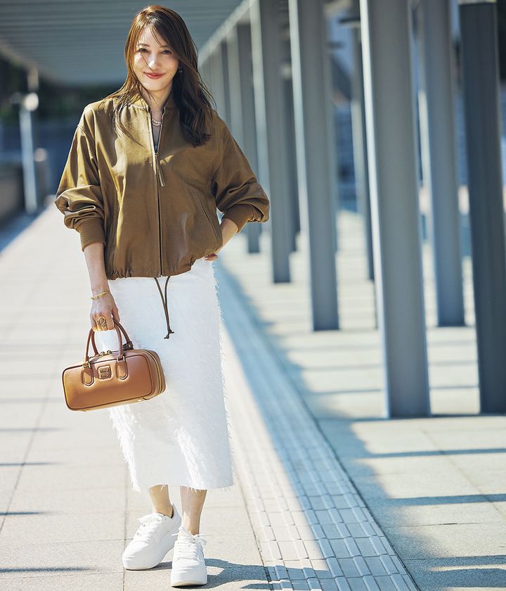 キラキラのフリンジスカートは渡韓時に店舗で購入。可愛くて普段使いできるものが見つかるので、必ずチェックするブランドです。レザーブルゾンとパールネックレスで甘辛ミックスに。秋はブラウンが気になっていて、miumiuのバッグでトレンド感を追加。