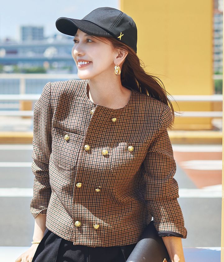 パク・ミニョンもドラマで着用していたブランド。手頃な価格なのに、長めのつばやゴールドのロゴがコーデを格上げしてくれます。ブランドのツイードジャケット×ワイドパンツは、キャップと厚底スニーカーで崩します。キレイめにしすぎないのが親しみやすさに。