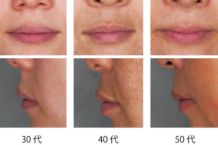 花王 メイクアップ研究所は10代から70代の日本人女性計139名の口元の形状変化を検討。加齢に伴い上唇下唇の縦幅はいずれも狭くなり、横幅は横に広がること、下唇の膨らみが減少することを確認。鼻の下は長くなり、丸みを帯びていくことが明らかに。加齢による内部組織の変化、筋肉下垂等の影響と考えられています。