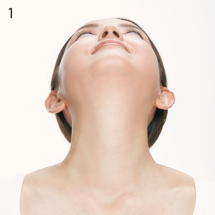 1.首筋にある胸鎖乳突筋を伸ばすように意識して、ゆっくりと真上を向きます。首が痛い時は正面を向いたままでもOK。