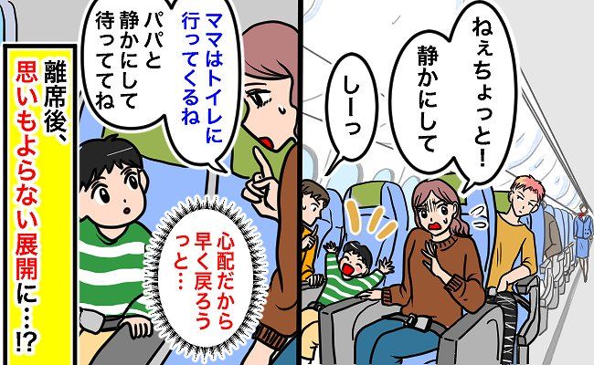「え?」機内の座席後ろには怖そうな男性。騒ぐ息子が心配で、急いでトイレから戻ると予想外の展開に!