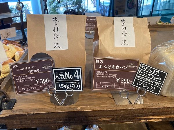 食パンの中では枚方れんげ米を使った食パンがとても人気でトースターで焼くと外はカリカリ中はモチモチしてとてもおいしいです。