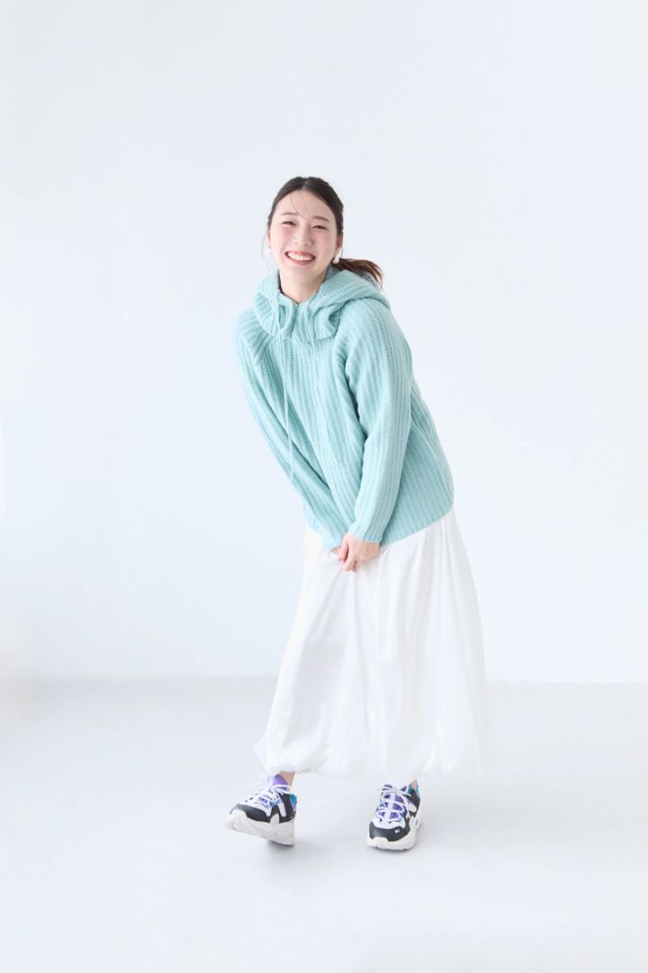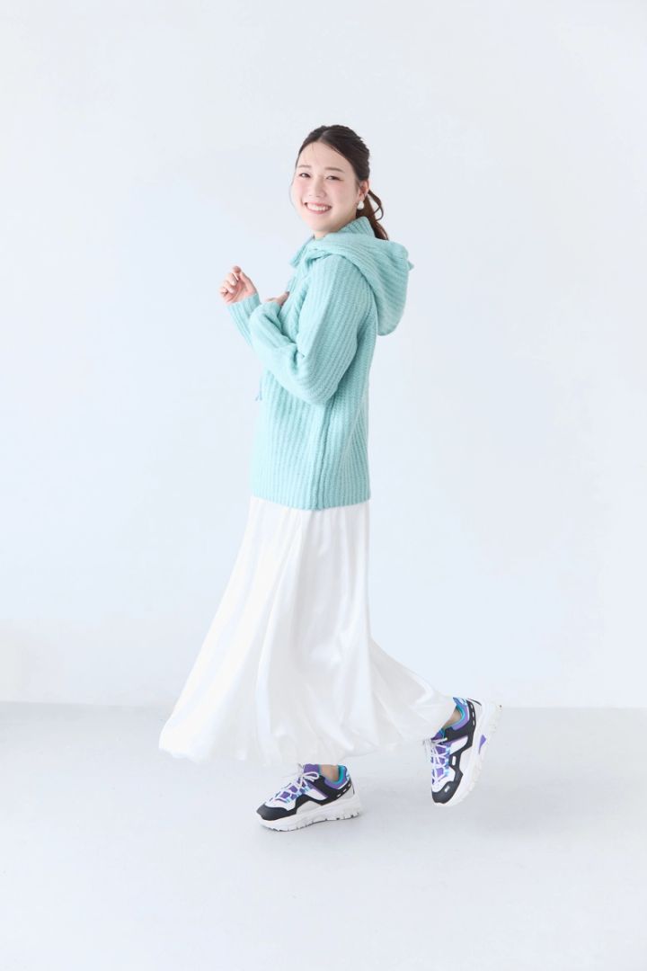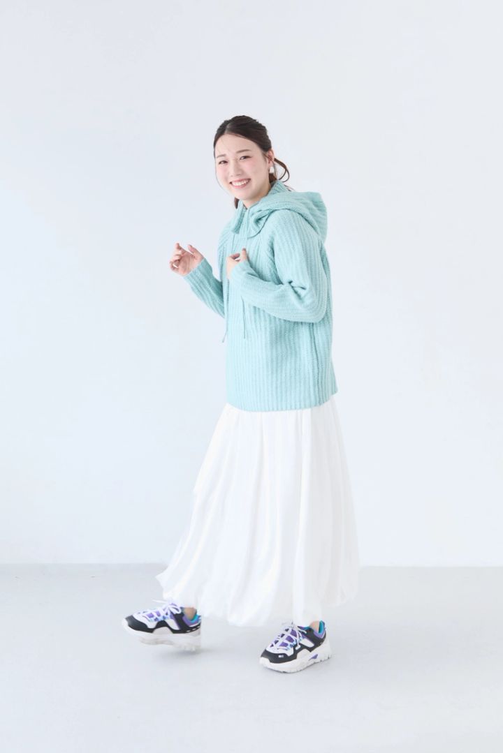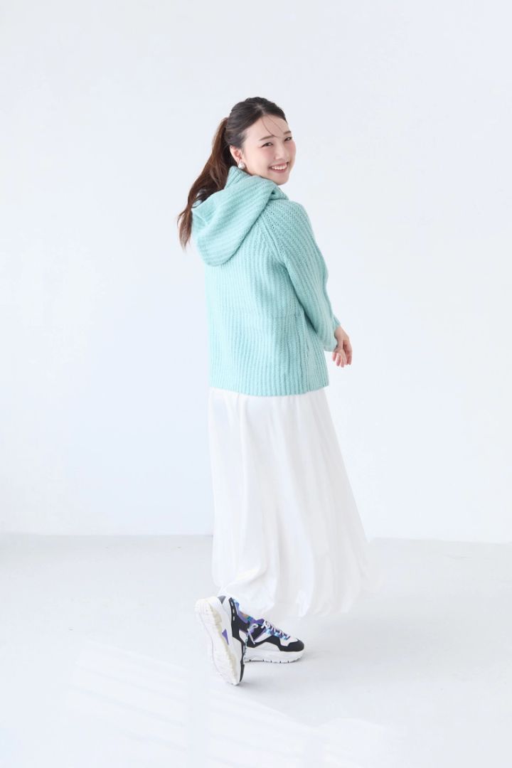 ざっくりニットは冬に着こなしたいNo.1アイテム。フード部分が取り外しできちゃう2wayなところも魅力だけど、やや長めの着丈なところもスカートにもパンツにも合わせやすくてヘビロテ間違いなし!ミントブルーには、スノーホワイトを合わせてとことん爽やかに。揺れ感がかわいいバルーンスカートが好相性。