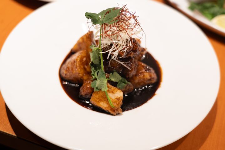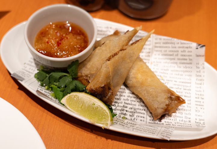 この春巻きは、軟骨のコリコリと皮のパリパリといった異なる食感が楽しめる一品です。豚肉の旨味が凝縮された餡には、チリソースの辛さに加えて、パクチー、ライム、ミントなどのフレッシュな風味が広がり、味わい深さが引き立ちます!